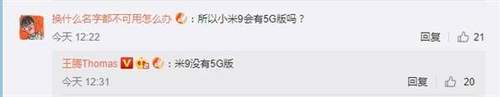 2月25日,米粉在微博提问小米公司产品总监王腾“小米9有没有5G版本”,王腾表示小米9不会推出5G版本。