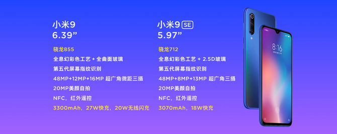 另外,核心配置上,小米9 SE首发高通骁龙712移动平台,最高配备6GB内存+128GB存储,后置4800万广角镜头+800万长焦镜头+1300万超广角镜头,电池容量为3070mAh。