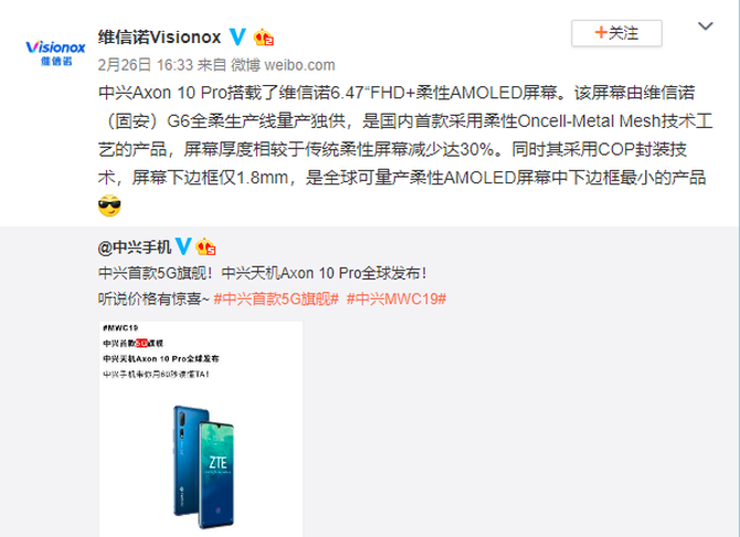 维信诺在在官微强调称,中兴Axon 10 Pro搭载了维信诺6.47“FHD+柔性AMOLED屏幕,该屏幕由维信诺(固安)G6全柔生产线量产独供,是国内首款采用柔性Oncell-Metal Mesh技术工艺的产品,屏幕厚度相较于传统柔性屏幕减少达30%。同时其采用COP封装技术,屏幕下边框仅1.8mm,是全球可量产柔性AMOLED屏幕的手机中下边框最小的。