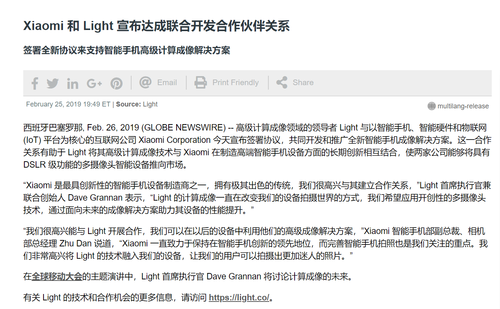根据成像方案公司Light最新发布的公告,小米已经正式与其达成合作协议,未来Light的成像技术将与小米的智能手机经验结合,共同开发和推广全新的智能手机成像解决方案。