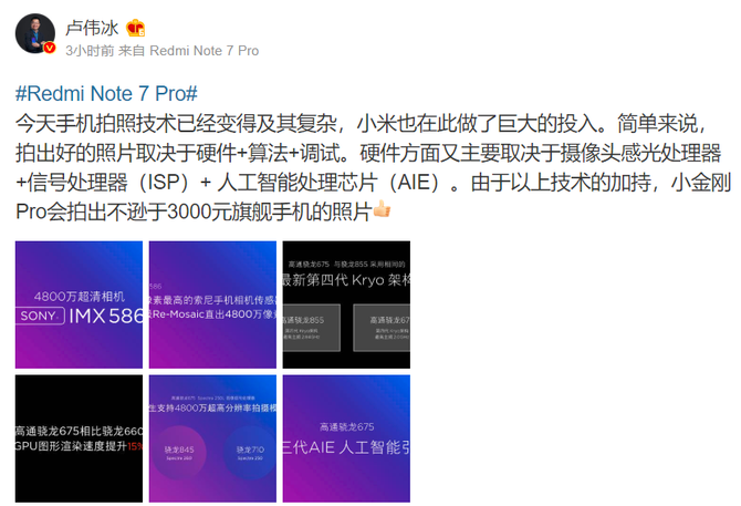 据悉,此次红米Note 7 Pro将搭载骁龙675处理器。主摄像头采用索尼IMX 586感光单元,像素达到真·4800万,相比主流1200万相机,提升了4倍的像素数,带来更高画质解析力。今日,小米集团副总裁、红米Redmi品牌总经理卢伟冰更是在微博表示,小金刚Pro拍照不逊于3000元档旗舰机。