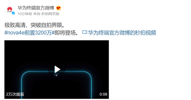 3月4日消息,@华为终端官方微博公布了一段nova 4e的预热视频,并预告其搭载前置3200万高清摄像头。根据视频来看,前置摄像头位置居中,屏幕解决方案很有可能采用的是水滴屏设计。