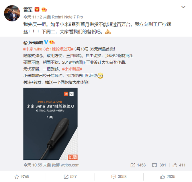 3月15日,小米商城发布微博,宣布米家wiha 8合1棘轮螺丝刀上线,售价99元。随后,雷军也转发了上述微博,并承诺:“我先买一把。如果小米9系列首月供货不能超过百万台,我立刻到工厂拧螺丝!!!下周二,大家看我们的备货吧。”