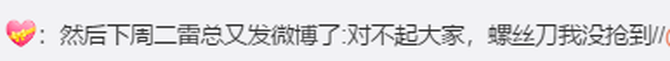 该微博一出就是被网友各种调侃,网友纷纷表示期待看到雷总在线拧螺丝的场景。还有网友表示:小米9,我要雷军拧螺丝版!甚至有网友帮雷军写好了下周二的剧本“雷军微博:对不起大家,螺丝刀我没抢到。”以此调侃小米9供货不足。