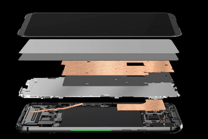 散热方面,黑鲨游戏手机2的散热不仅仅局限于我们常见的热管,而是采用热板+热管组合的全域散热设计。在屏幕与主板之间,采用超大面积的热板+热管(含液量提升5倍,散热面积提升5倍),覆盖全部发热部件,实现分区直触散热、独立热控。同时散出的热量也可依托金属中框快速、均匀地从机身后部排出,达到热源分散的设计,避免避免热源叠加。整个散热面积达到14555mm²,传热能力达到20W,使得CPU运行帧率运行时间提升700%。