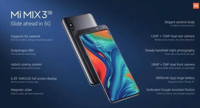 小米在MWC上带来了旗下首款5G手机,小米MIX 3 5G版,搭载的骁龙855处理器和X50调制解调器(下载速度可达2Gbps),其他方面则与普通版Mix 3保持一致,配备6.39英寸全高清+显示屏,磁性滑盖,内置双(24MP + 2MP)自拍相机,陶瓷机身,双12MP摄像头背部和3800mAh电池,支持Quick Charge 4+快速充电。