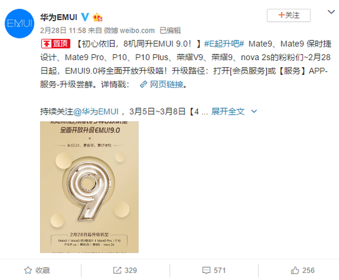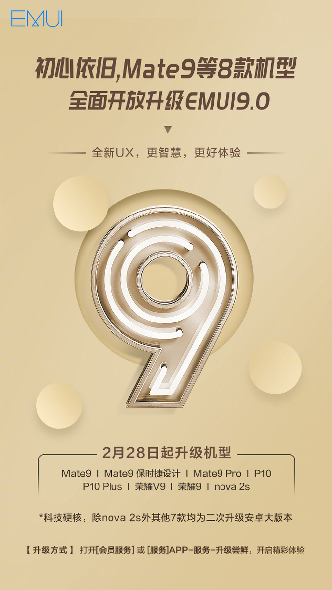2月28日消息,华为官方宣布,Mate9、Mate9 保时捷设计、Mate9 Pro、P10、P10 Plus、荣耀V9、荣耀9、nova 2s八款机型全面开放,同升EMUI 9.0,开启全新UX、更智慧的EMUI9.0精彩体验,升级EMUI9.0后,还支持VoLTE技术。