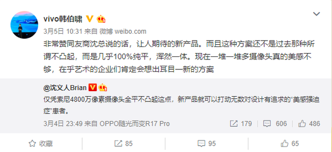 在前天OPPO副总裁沈义人与vivo的产品经理韩伯啸与微博互动中表示,就凭索尼4800万像素摄像头全平不凸,新产品就可以打动无数对设计有追求的“美感强迫症”患者。 韩伯啸表示完全赞同。