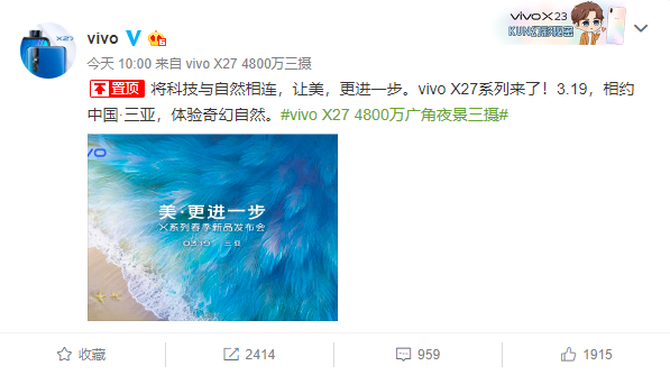 3月7日上午,vivo官方发布微博称,vivo X27系列春季新品发布会将于3月19日在三亚举办,发布会主题为“美·更进一步”。