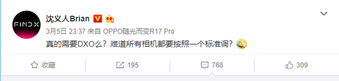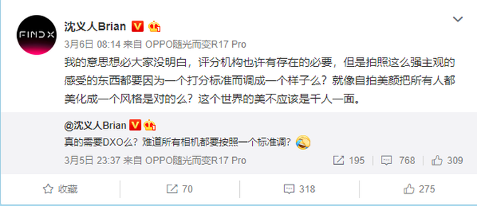 3月5日,OPPO副总裁沈义人发布微博称,真的需要DXO么?难道所有相机都要按照一个标准调?