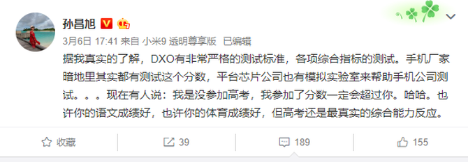 3月6日下午,小米产业投资部合伙人孙昌旭力DxOMark发布微博称,DXO有非常严格的测试标准,各项综合指标的测试。手机厂家暗地里其实都有测试这个分数,平台芯片公司也有模拟实验室来帮助手机公司测试。现在有人说:我是没参加高考,我参加了分数一定会超过你。哈哈。也许你的语文成绩好,也许你的体育成绩好,但高考还是最真实的综合能力反应。