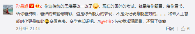 有网友评论称,不像小米知道题目,背了答案。孙昌旭回复到现在的国外的考试,就是给你题目,看书,看资料,看谁的答题最精彩。这是综合能力的表现,不是死记硬背能应对的。将来人工智能时代更是如此,多看点书,多学点知识吧。