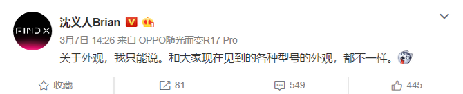 其实,相较于闭门造车,这种通过社交媒体的互动更能够及时的了解用户的心声,挖掘用户的喜欢。OPPO与用户的沟通方式的这种改变,沈义人频繁的猛料“轰炸”让我们对OPPO这款神秘新旗舰反而会感到愈发期待。昨天下午,沈义人再次通过微博爆料了新品外观信息,不过并未详细透露,只是说出了新品外观与目前市面上各种型号智能手机的外观都不一样,更是引起了网友的各种联想和猜测。