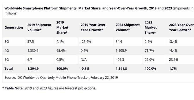 3月8日消息,市场分析机构IDC发布最新市场调研报告称,预计,5G设备在2019年内的总体出货量将只有670万部,约占当前全球总市场0.5%的份额,相当于3G手机出货量的八分之一。