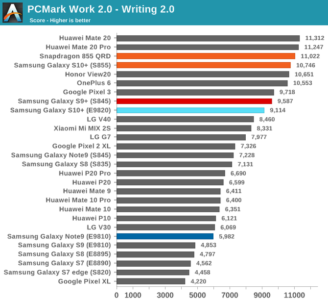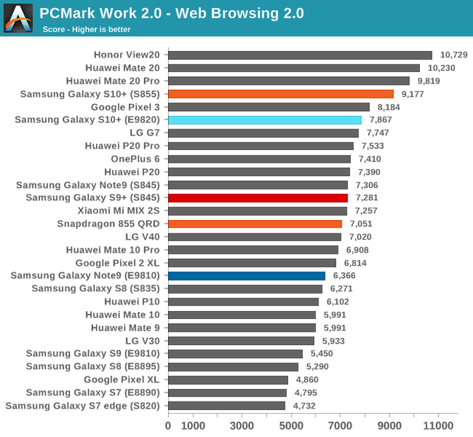 在网页渲染的测试中我们可以看到Exynos9820版的S10+得分是7867,骁龙855版的S10+是9177,二者间的差距有1千多分,但荣耀V20比这两台手机高,而且领先一众旗舰,而且其他的测试项目上,使用华为麒麟980的华为Mate 20系列,荣耀V20的表现都要比三星S10出色。