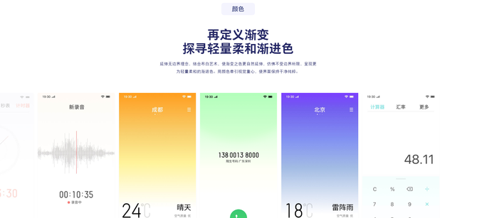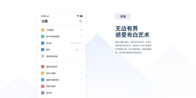 ColorOS 6全新界面摒弃了大量分割线,用空白构筑空间。利用严格规律的布白艺术,打造清晰的界面层次感。减少信息密度,舒缓信息焦虑。每个界面呈现更为轻量柔和的渐进色,用颜色牵引视觉重心,给用户带来更优雅舒适的界面体验。