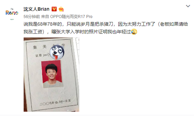 沈义人何许人也?OPPO的副总裁,负责中国市场业务。这个职位可是企业的核心骨干人员啊,这相当于小米的王川,魅族的李楠。如果你认为沈义人像雷军,余承东这样的“老男人”那就大错特错了,沈义人可是正儿八经的80后。就在今日沈义人在微博上自曝毕业证上的照片说:我也年轻过。