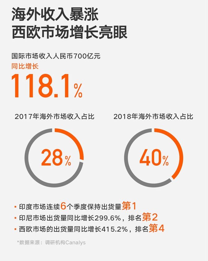 小米海外收入暴涨,国际收入700亿元人名币,占了小米全年收入的40%。其中印度的出货量保持第一,这得益于小米/红米在印度积极抢占市场的结果。
