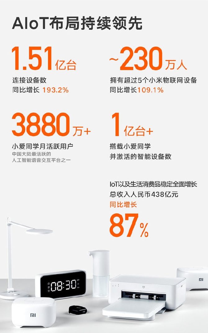 小米的AIoT布局依然领先,设备数量同比增长193.2%,约230万人同时拥有超过5个小米物联设备。这得益于小米的物联设备全面、好用、便宜,让更多的消费者体验到科技的乐趣这句话不仅适用于手机上,这是贯穿整个小米的产品理念。