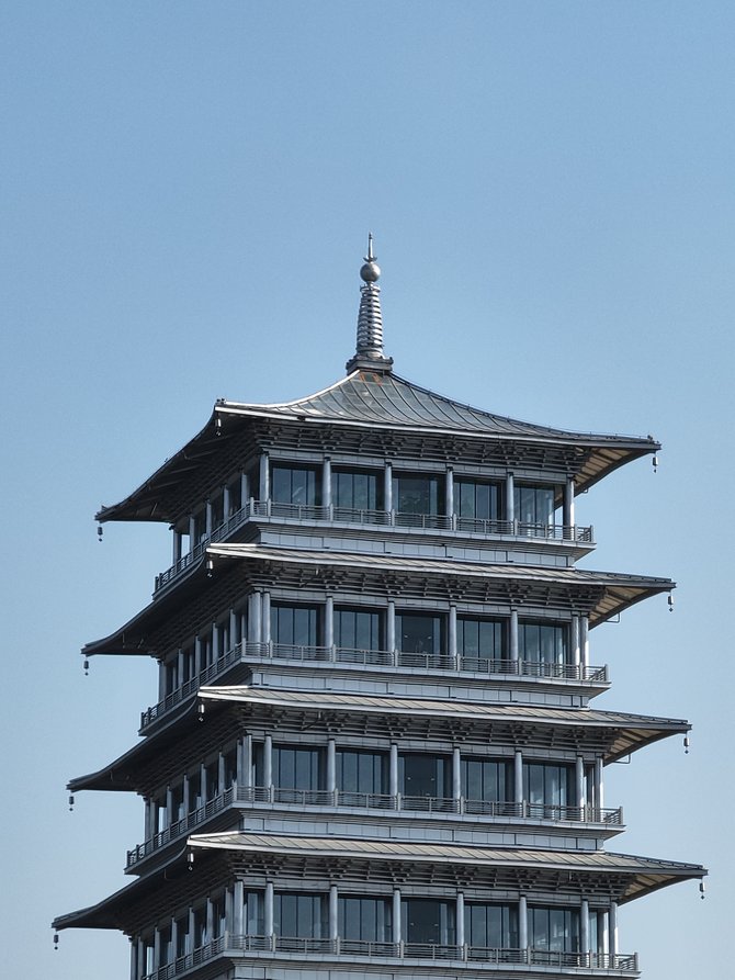 再看这张图片10倍后的效果,在长安塔顶部,每一块窗户连同塔内棚顶的灯具拍得都非常清楚,明亮处与暗处自然分明。