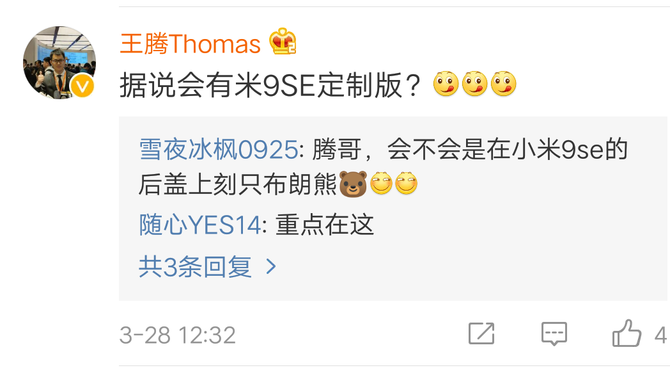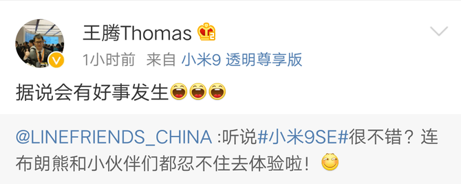 今天中午,小米公司产品总监@王腾Thomas发布微博称,小米9 SE会有“布朗熊”定制版,随后秒删,不过还是被细心的网友截图到了。随后王腾改口称“据说会有好事发生。”